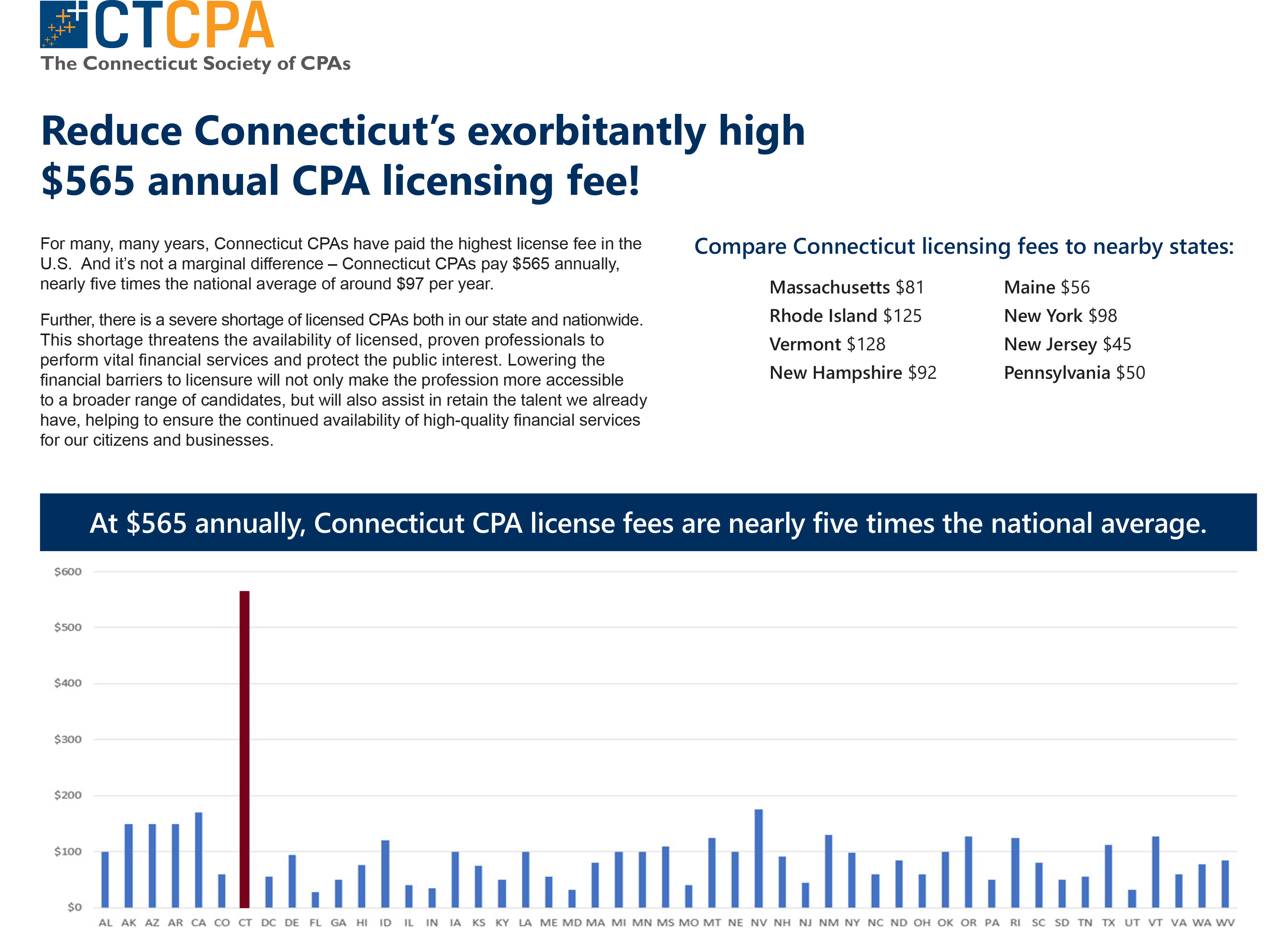 Reduce Connecticut’s exorbitantly high $565 annual CPA licensing fee!